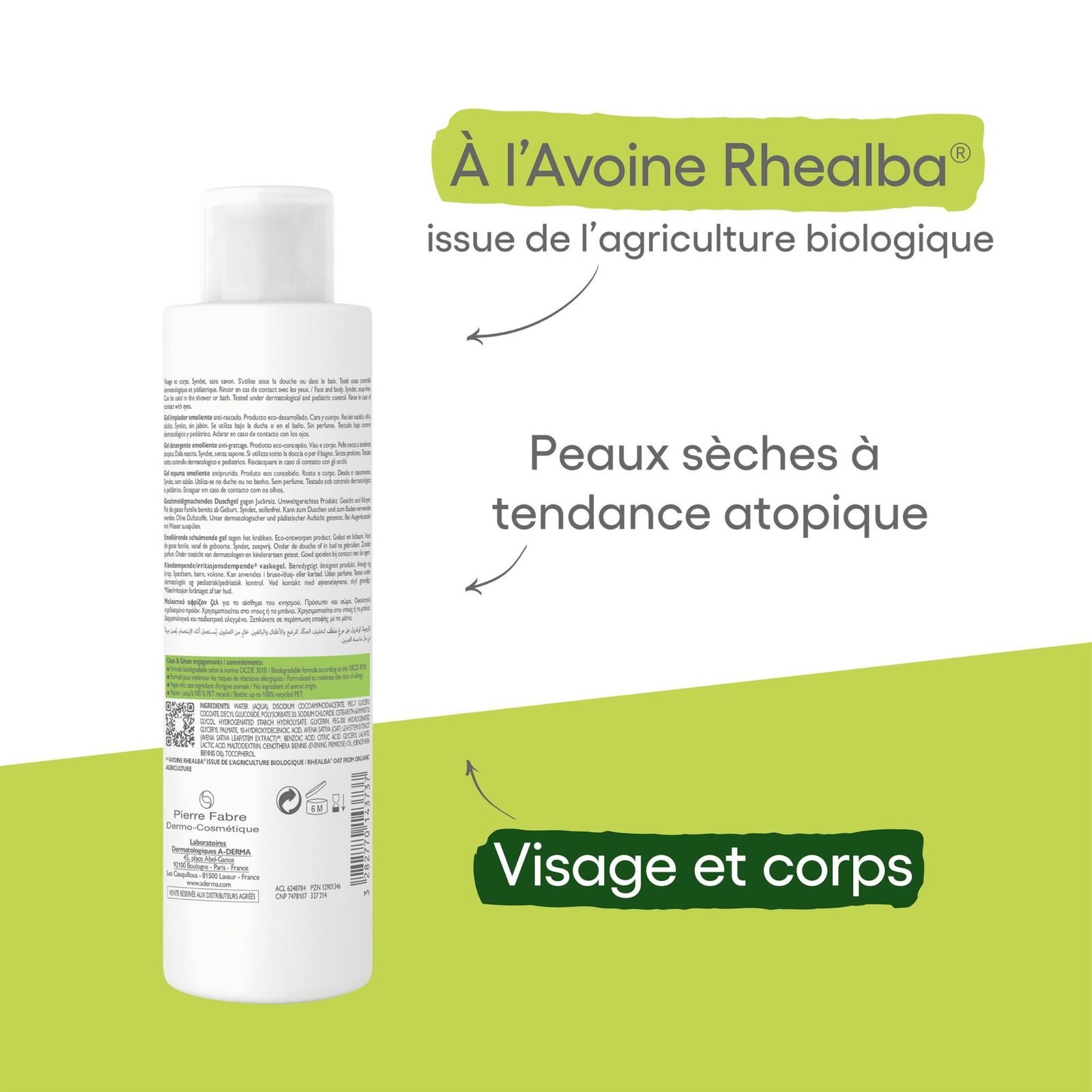 Soin d’hygiène émollient quotidien visage et corps, Le gel moussant émollient nettoie en douceur, apaise et protège les peaux sèches à tendance à l’eczéma atopique (visage et corps).