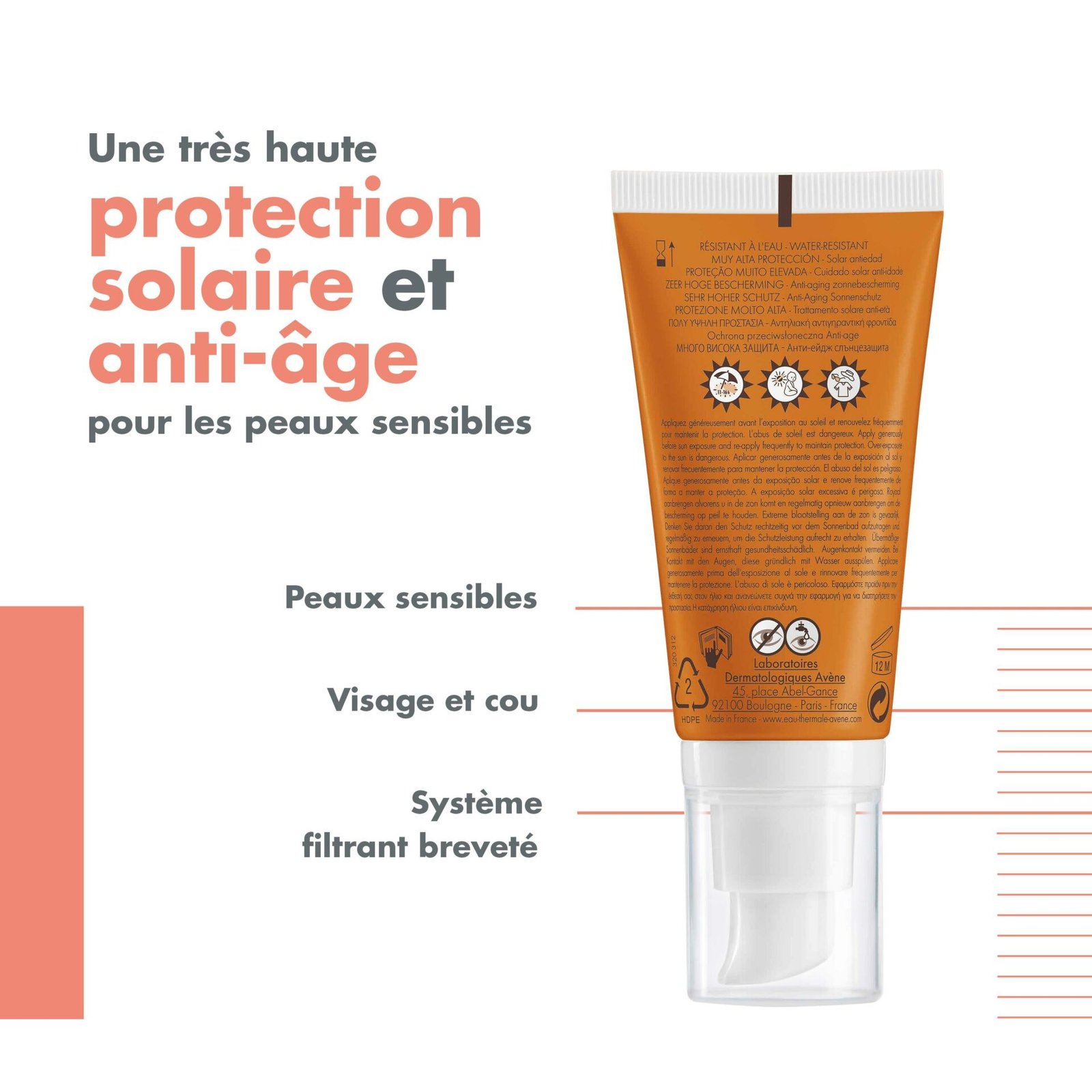 – D’Eau thermale d’Avène reconnue pour ses propriétés apaisantes, anti-irritantes et adoucissantes. Solaire anti-âge SPF 50+ est photostable, anti-oxydant, résistant à l’eau, sans parfum et offre un toucher sec.Pratique, son tube-pompe permet de doser facilement la juste quantité de produit à appliquer.*Activité évaluée in-vitro.