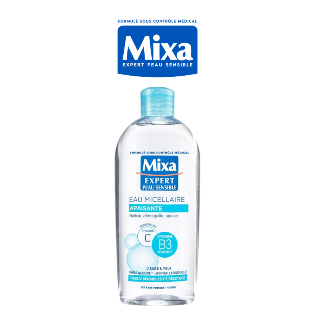 L’Eau Micellaire Mixa nettoie les peaux sensibles et réactives dans le plus grand respect.
