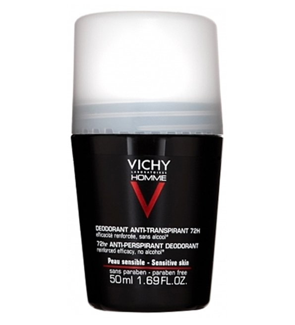 VICHY HOMME Déodorant Anti-Transpirant 72h combat la transpiration excessive et les mauvaises odeurs.